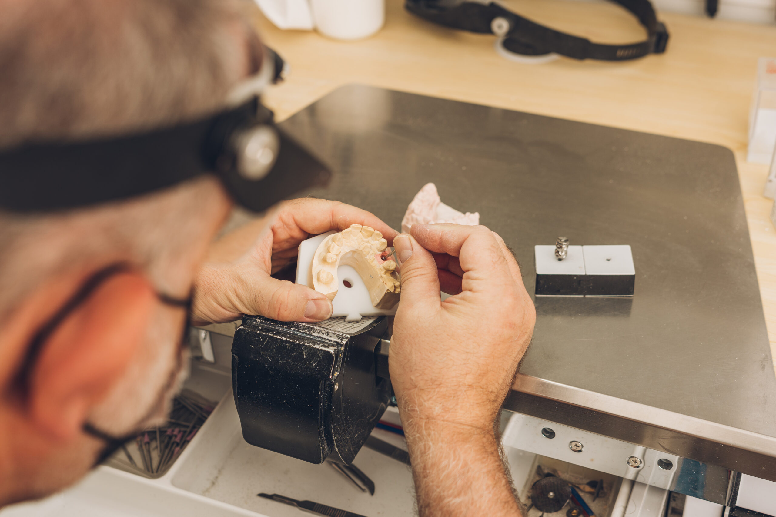 Close-up view of the hands of a man working on one of the pieces of a ceramic mould in a dental laboratory